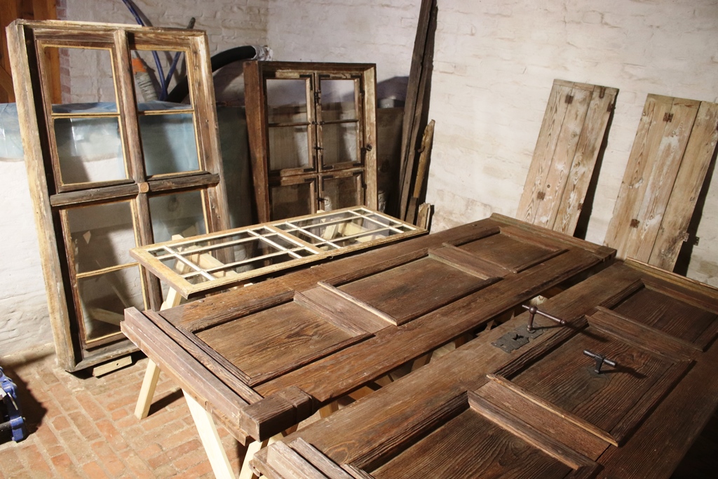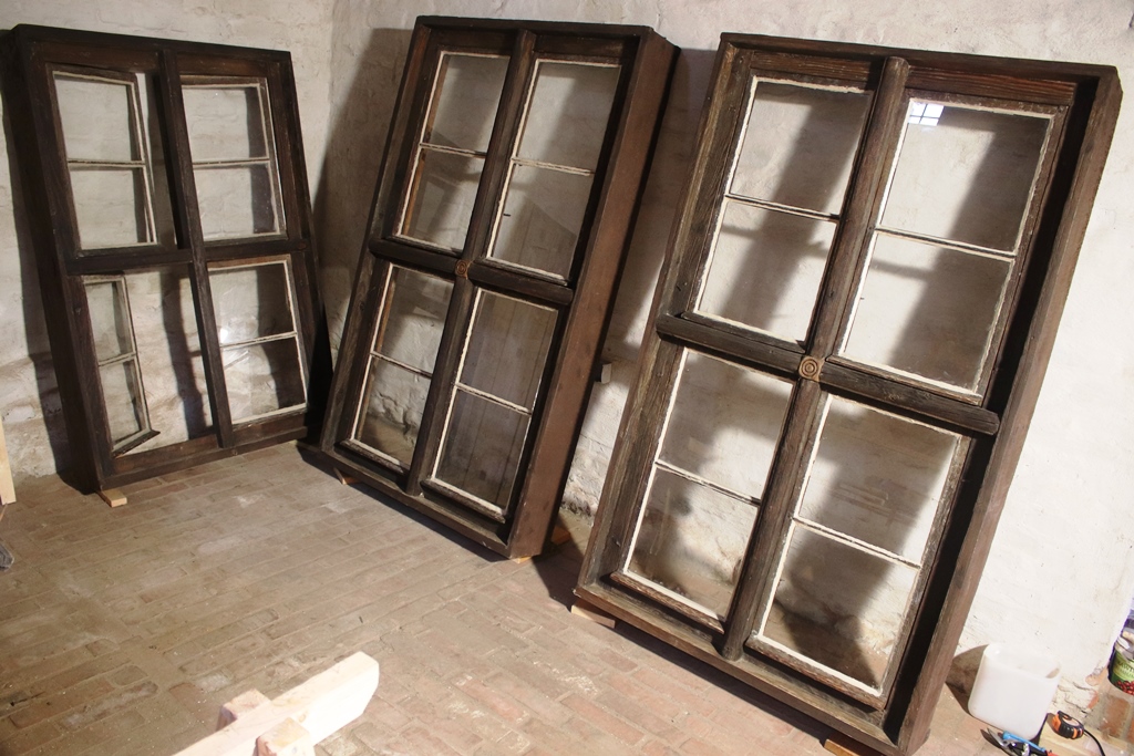 Pierwszy rzut prac przy stolarce z 2021 r. objął drzwi frontowe i sąsiednie od zachodu okna parteru. W drugim etapie, w 2022 r., poddano konserwacji frontowe okna parteru od wsch. i jedno z piętra od pn. W każdym przypadku prace te polegały na demontażu kolejnych elementów ze ścian, a następnie pełnej ich konserwacji w pracowni przy maksymalnym zachowaniu oryginalnego materiału drewnianego i metalowych okuć, koniecznym uzupełnieniu ubytków i wzmocnieniu konstrukcji. Przebadano też relikty warstw malarskich pozostawiając finalne opracowanie kolorystyczne do czasu montażu całej stolarki w otworach wyremontowanych ścian.