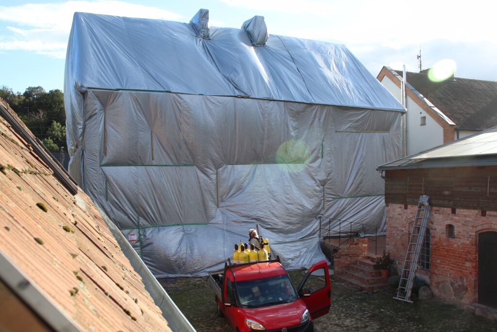 Prace konserwatorskie w bieżącym roku zostały dość nieoczekiwanie, lecz zgodnie ze wskazaniami konserwatorskimi z 2023 r., poszerzone o kompleksową fumigację (dezynfekcją) całego budynku, wstawioną w rytm prac zabezpieczających jej główny materiał konstrukcyjny, drewno sosnowe, ulegające widocznej destrukcji. Specjalistyczne prace firmy CARSEKT z Gostynina, po opakowaniu bryły domu powłoką z folii („zafoliowaniu”), przeprowadzone w dn. 27-29.09.2024 r. z użyciem ponad 82 kg fluorku sulfurylu, dawały gwarancję pozbycie się owadów-drewnojadów, pustoszących strukturę drewna. Prace przy fumigacji, jako następny, istotny etap prac konserwatorskich przy zabytku, zostały kolejny raz z rzędu dofinansowane z budżetu Urzędu Marszałkowskiego Województwa Wielkopolskiego w Poznaniu.