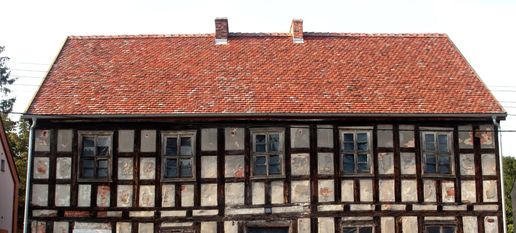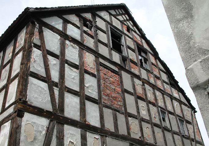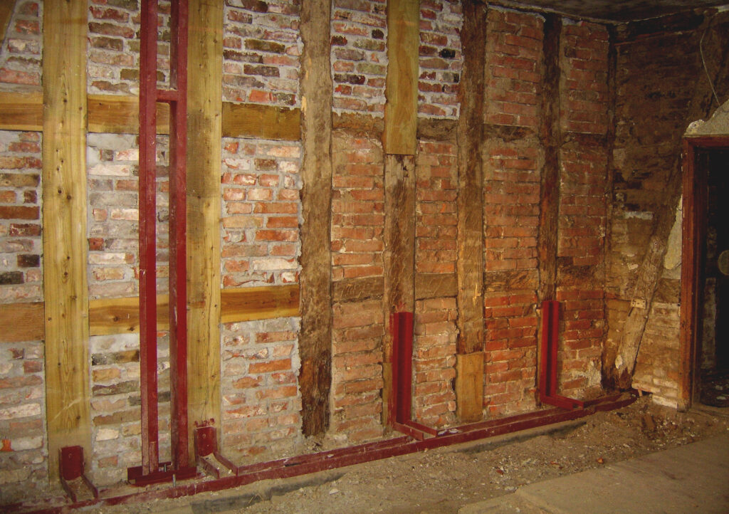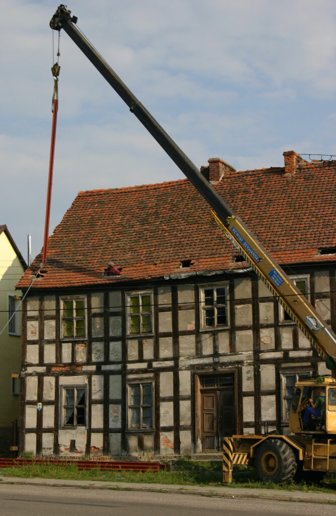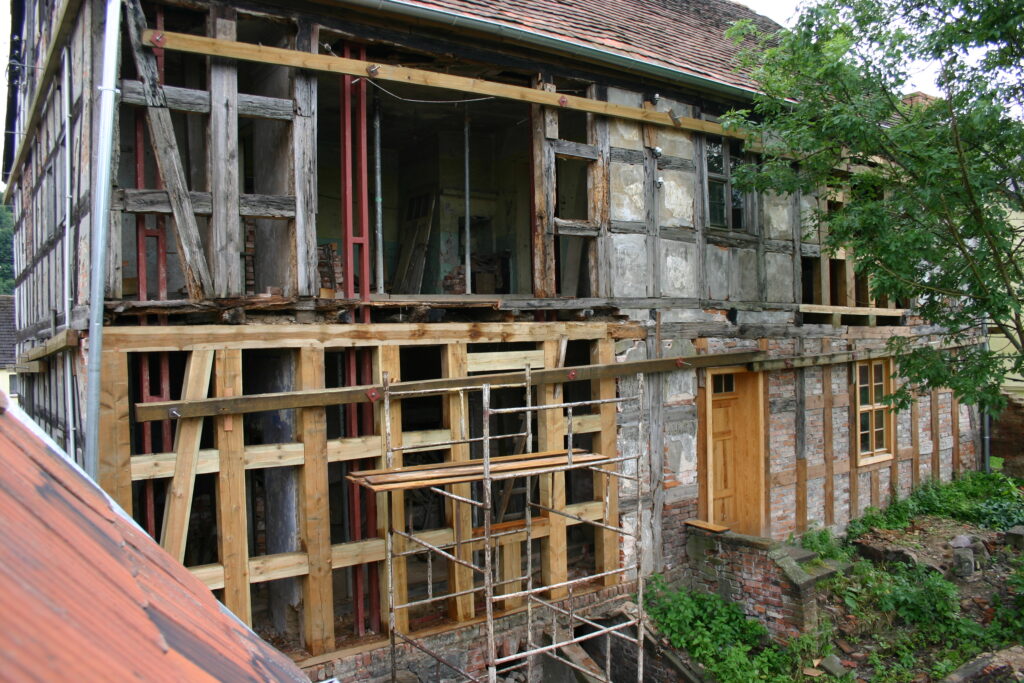 Z myślą o długoletniej perspektywie, wytyczonej przez projekt budowlany, zdecydowano się na mały program pilotażowy w obrębie sieni domu, obejmujący konstrukcję ścian obwodowych. Zachowując na zewnątrz ścianę drewnianą w układzie ryglowym wymurowano na odcinku ściany północnej od wewnątrz – zgodnie z planem – drugą warstwę muru z litej cegły suszonej lekkiej, produkowaną przez Manufakturę Surowe k. Pasłęka, przełożoną termoizolacyjną matą drzewną (f-my STEICO). Tak wzbogacona konstrukcja muru, modelowa dla całego obwodu ścian, daje możliwość przystosowania budynku do współczesnych norm i standardów mieszkaniowych, przy ciągłym zachowaniu tradycyjnej technologii drewna i gliny.